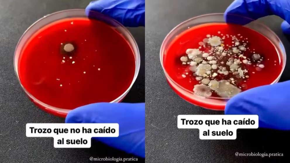 Para la prueba, se utiliza un trozo de comida que ha tocado el suelo por solo unos segundos y se lo coloca sobre una placa Petri con agar, un medio gelatinoso que permite el crecimiento y la visibilidad de bacterias. Para comparar, se usa otro trozo de comida que no ha tocado la superficie.