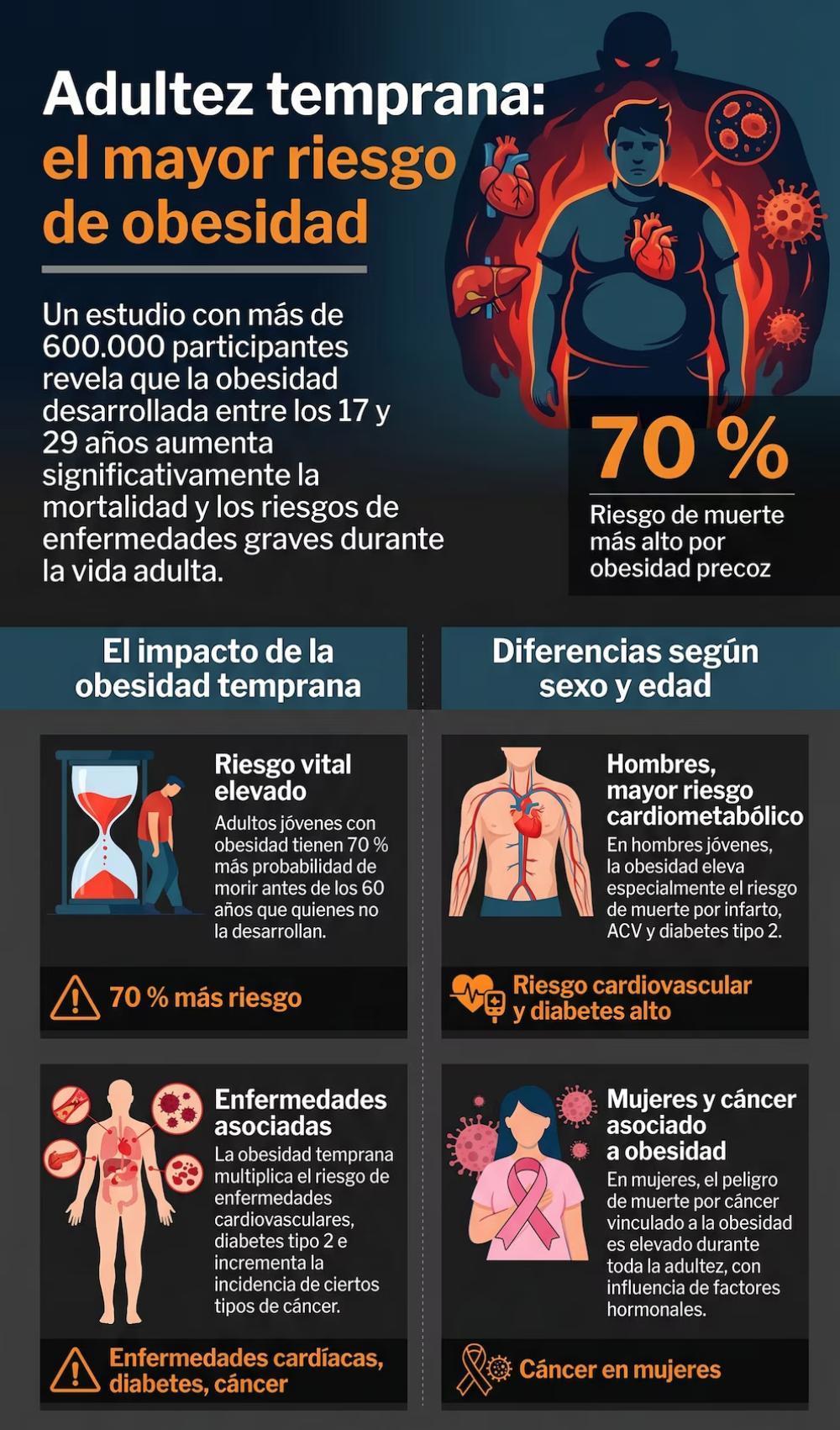 El grupo que presentó obesidad por primera vez en la adultez temprana tuvo aproximadamente un 70% más de probabilidades de fallecer durante el seguimiento, comparado con quienes no desarrollaron obesidad antes de los 60 años, según la investigación publicada en eClinicalMedicine. Este riesgo adicional incluye principalmente enfermedades cardiovasculares, diabetes tipo 2 y ciertos tipos de cáncer.