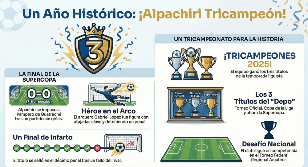 Deportivo Alpachiri se consagró campeón de la Supercopa de la Liga Regional Sureña al derrotar por penales a Pampero de Guatraché, luego de igualar sin goles en el tiempo reglamentario, en la final disputada el domingo por la noche en el estadio Carlos Javier Mac Allister de Bernasconi.