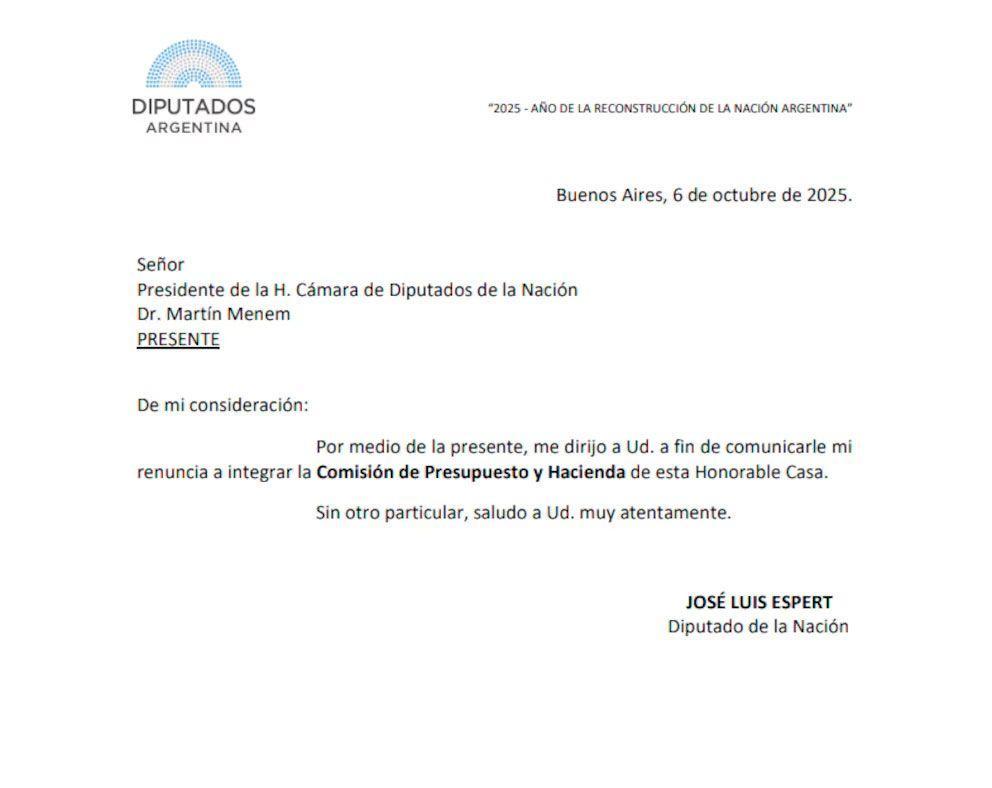 José Luis Espert presentó este lunes su renuncia a la presidencia de la Comisión de Presupuesto y Hacienda de la Cámara de Diputados, en medio del escándalo por su relación con el empresario Fred Machado, investigado por narcotráfico en Estados Unidos.