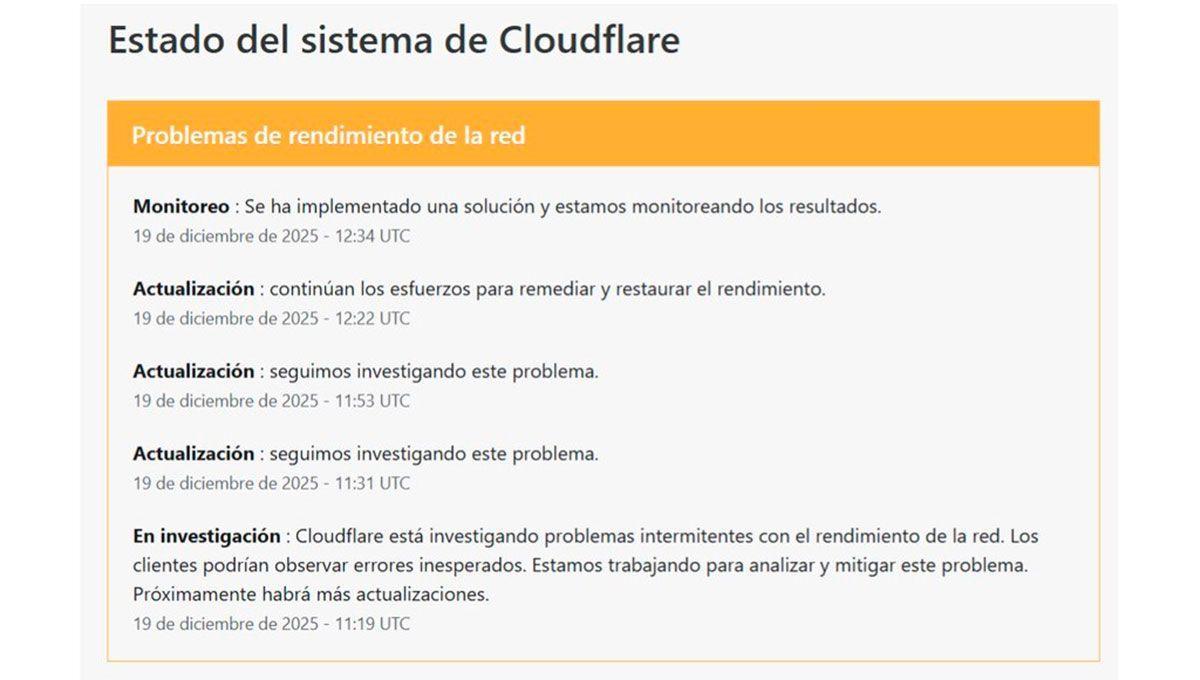 La compañía informó que investigaba la situación. "En investigación: Cloudflare está investigando problemas intermitentes con el rendimiento de la red. Los clientes podrían observar errores inesperados. Estamos trabajando para analizar y mitigar este problema", comunicó.