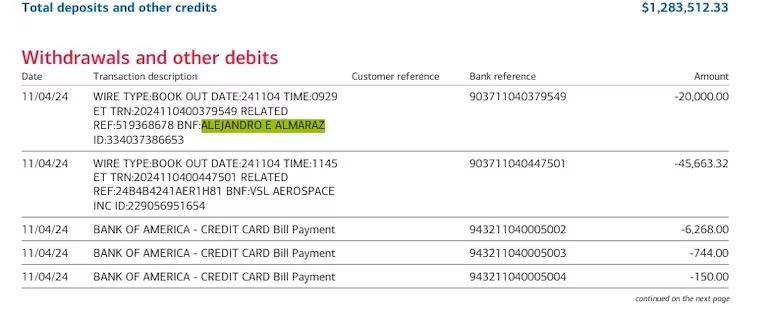 Registros bancarios de Estados Unidos consignan transferencias por US$340.000 desde TourProdEnter LLC, empresa que recauda ingresos de la Asociación del Fútbol Argentino (AFA) desde diciembre de 2021, hacia Alejandro E. Almaraz, con domicilio en el estado de Georgia. Los envíos se registraron por primera vez el 14 de mayo de 2024 y se repitieron luego de manera mensual, con un total de 17 transferencias de US$20.000.