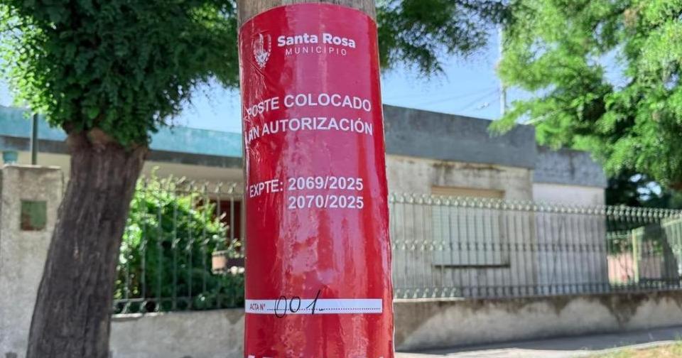 Clarín "escrachado". Algunos de los postes que el Grupo Clarín instaló sin autorización en la capital de La Pampa fueron señalizados por el gobierno municipal, que además aplicó a Telefónica una multa por más de $54 millones.