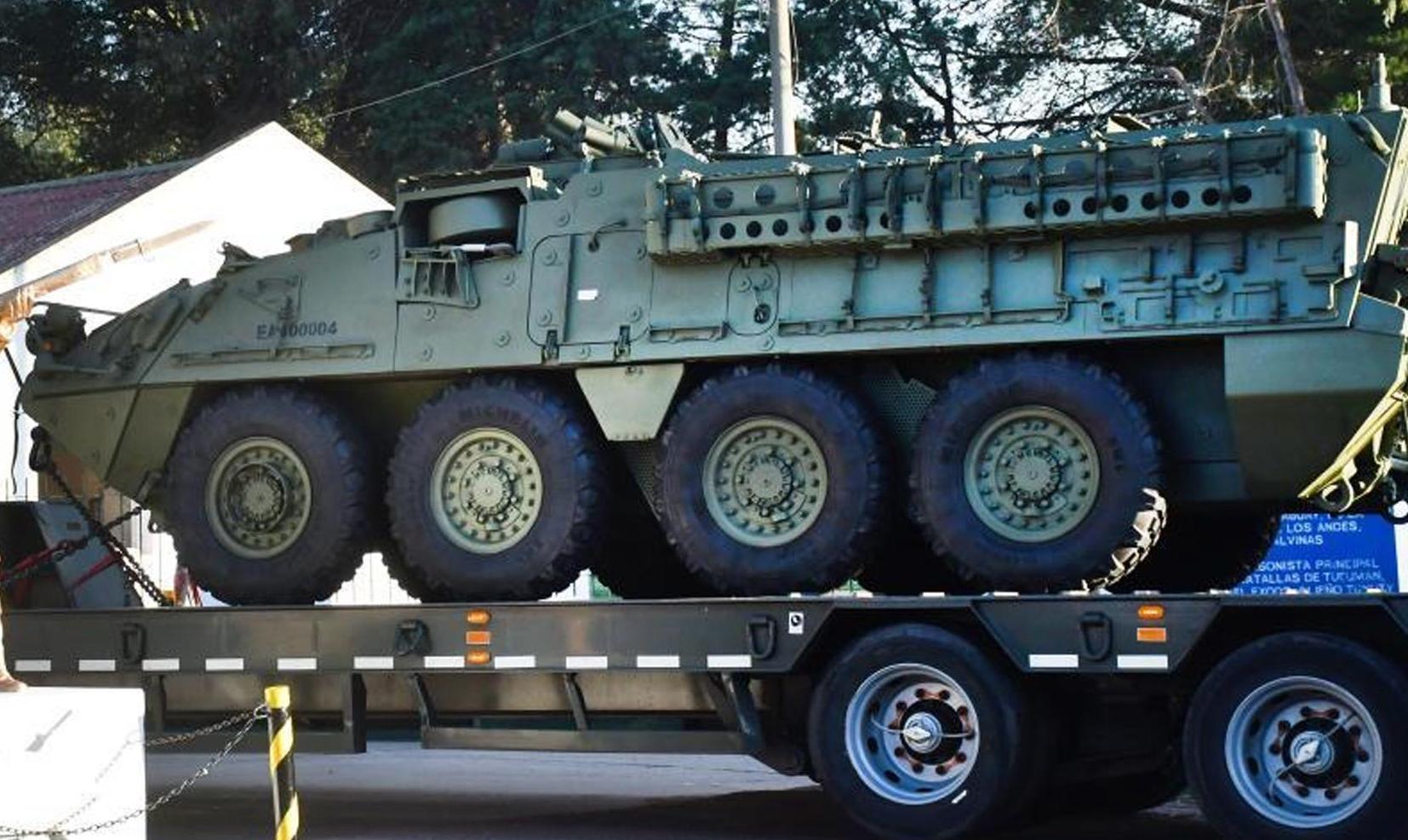 "Tanquecitos". El Ejército Argentino movilizó ocho unidades "Stryker" desde la Dirección de Arsenales de Boulogne, en provincia de Buenos Aires, hacia el Regimiento de Toay.