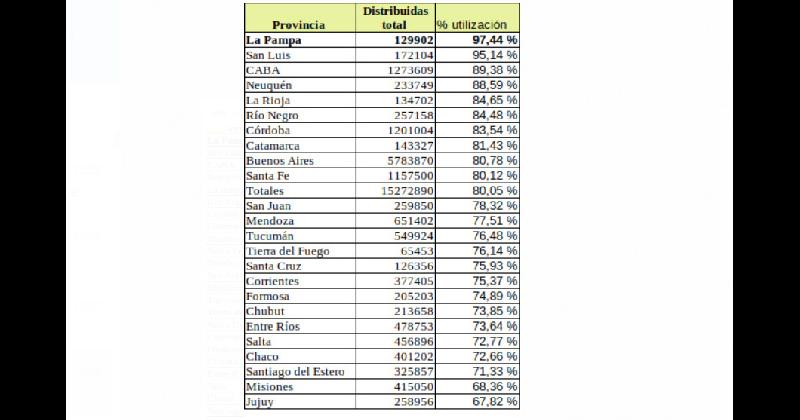 La Pampa encabeza el ránking de las provincias con mayor porcentaje de aplicación, con relación a la distribución de dosis por parte del Gobierno Nacionañ.