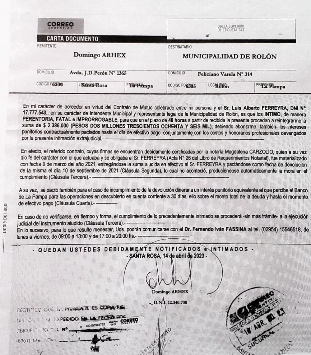 Según Rodríguez el intendente municipal firmó "un Contrato de Mutuo en nombre de la Municipalidad de Rolón, es decir lo que a los términos de la ley orgánica sería un EMPRESTITO (art. 85), con un tercero, por la suma de dos millones trescientos ochenta y seis mil pesos ($2.386.000) el 29 de marzo de 2021, haciéndolo a ESPALDAS del Concejo Deliberante, sin informa ni solicitar la debida autorización exigida por ley".