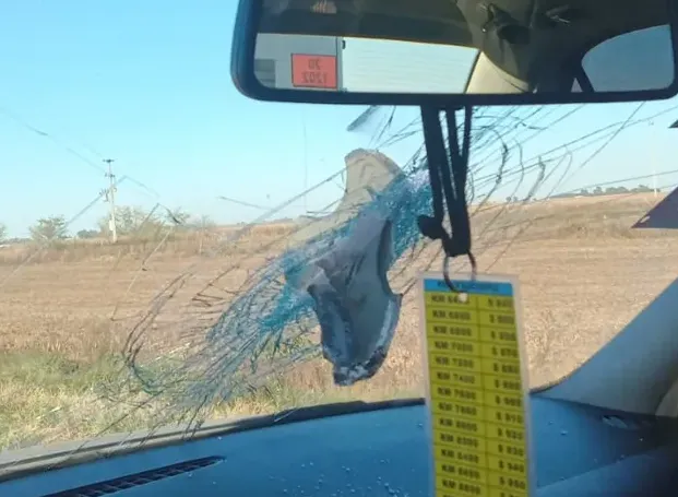 Una llanta de camión que transportaba combustible se romió y salió como una arma arrojadiza hacia el parabrisas de un auto, que iba atrás: el pedazo de hierro se incrustó en el parabrisas, mostrando la gravedad de lo ocurrido.