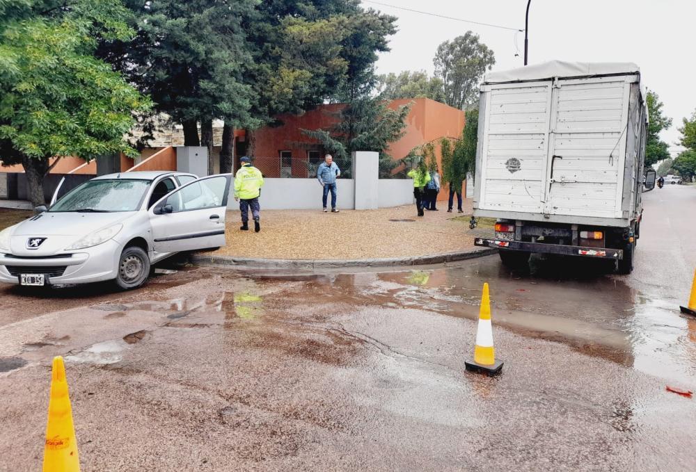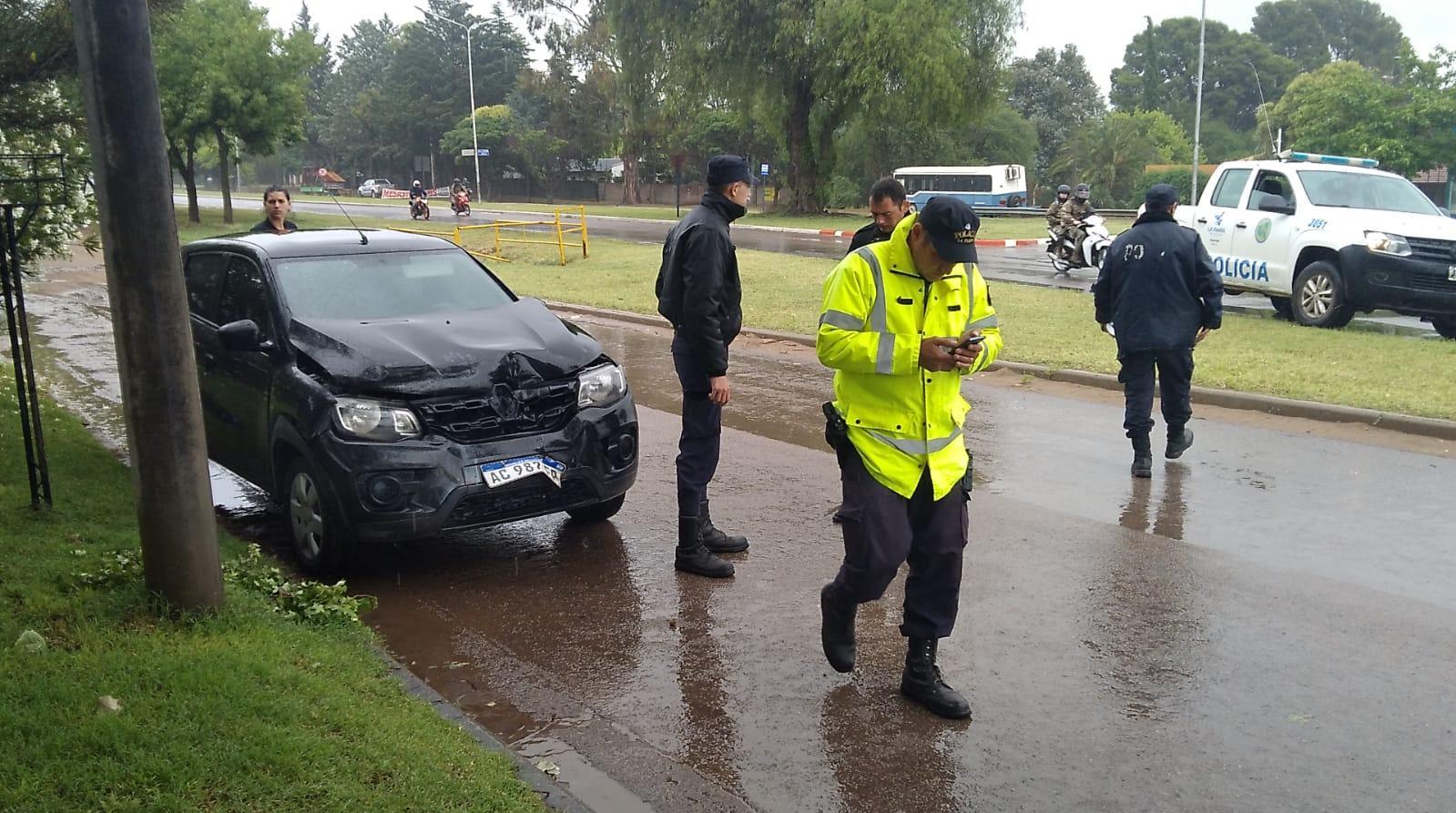 En la avenida Perón, esquina con la calle D'atri, un vehículo que bajó a la colectora chocó contra un árbol. Fue mientras llovía. No hubo lesionados, aunque el auto registró importantes daños en la trompa.