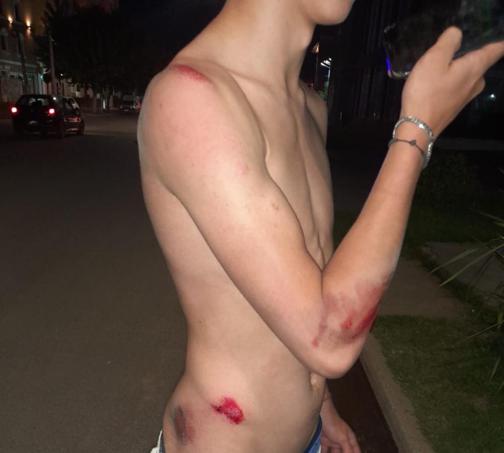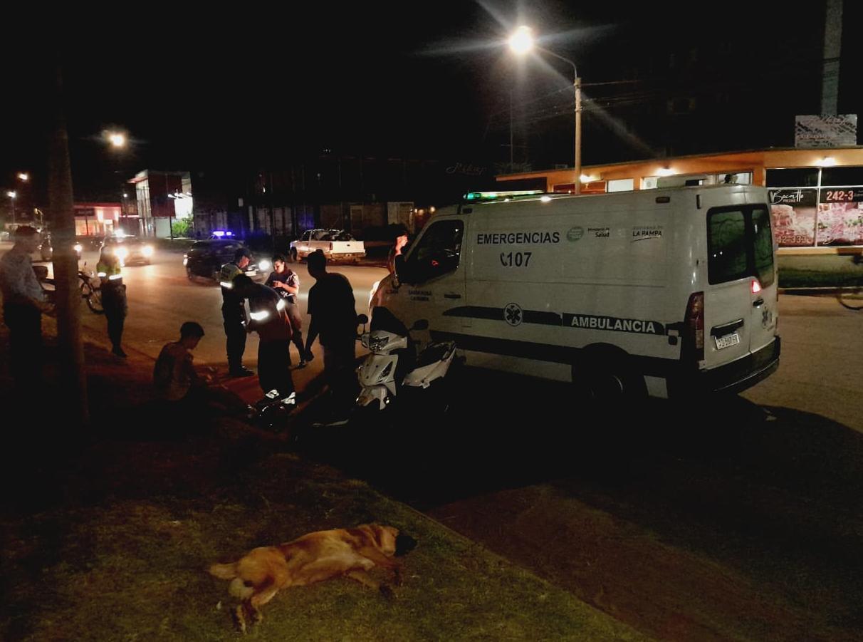 Dos jóvenes iban en una moto 110. Un perro se les cruzó en ese tramo de la avenida Ameghino. Derraparon y cayeron al asfalto, sufriendo raspones y lesiones en la piel en varias partes del cuerpo.