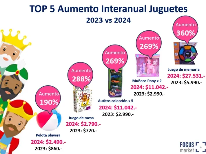 A continuación podemos ver que al relevar los mismos juguetes este año con respecto al año anterior, el aumento interanual 2023 vs 2024 asciende hasta un 360%.