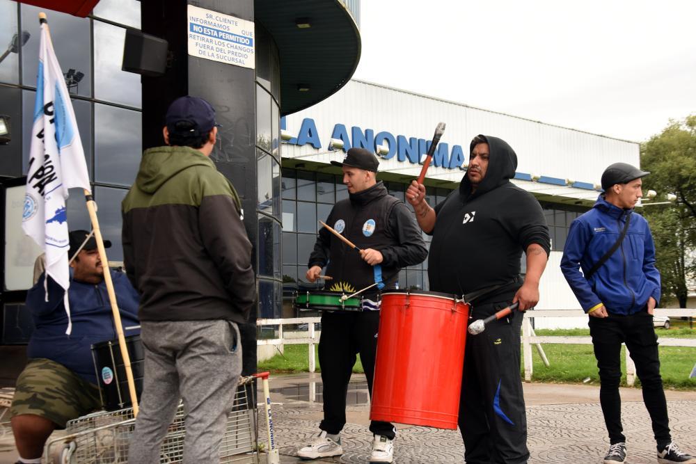 Representantes de la Unión Personal de Seguridad Privada y Afines de la Patagonia (UPSAP) realizan este miércoles una medida de fuerza frente a la sucursal de La Anónima sobre la calle Ameghino, en Santa Rosa.