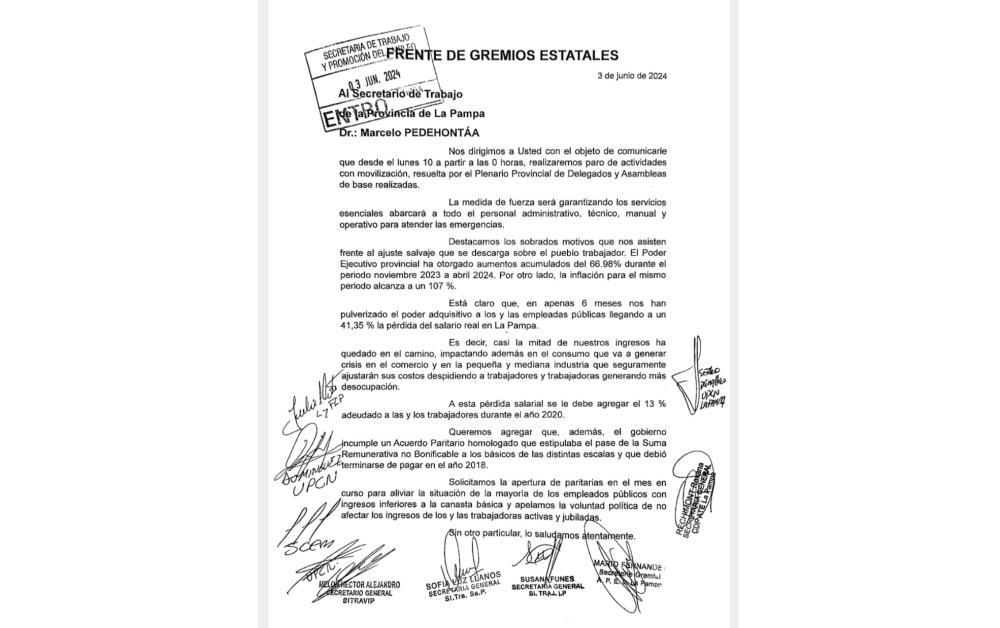 "En apenas 6 meses, nos han pulverizado el poder adquisitivo a los empleados y las empleadas publicas, llegando a un 41,35% la perdida del salario real en la Pampa", advirtieron los gremios en el escrito que le enviaron al secretario de Trabajo, Marcelo Pedehontáa.