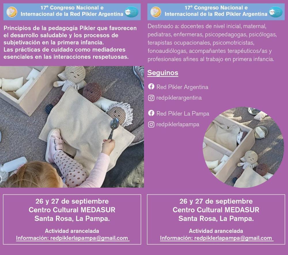 Los días 26 y 27 de septiembre se realizará en Santa Rosa (La Pampa) el XVII Congreso Internacional de la Red Pikler Argentina.