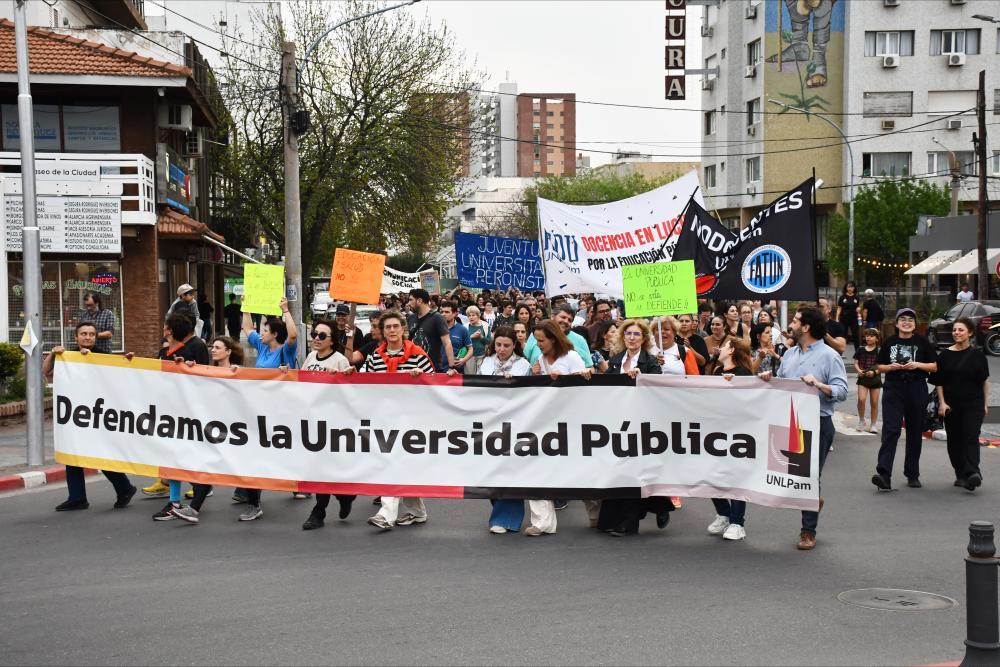 El cartel que encabezó la marcha tenía la consigna "Defendamos la Universidad Pública", con el logo de la UNLPam.