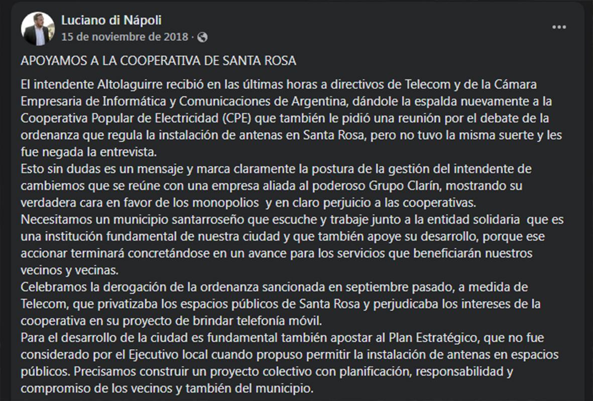 Di Nápoli negó un giro ideológico respecto a las cooperativas y su lucha contra los monopolios y lanzó réplicas a las críticas que lanzó en El Diario el expresidente de la CPE, Oscar Nocetti. También intentó despegarse del lobby de Clarín a través del sindicato telefónico al que pertenece la viceintendenta, Romina Montes de Oca. Además, el jefe comunal sugirió "diferencias" entre el expresidente y la conducción actual de la CPE, que encabeza el joven Manuel Simpson.