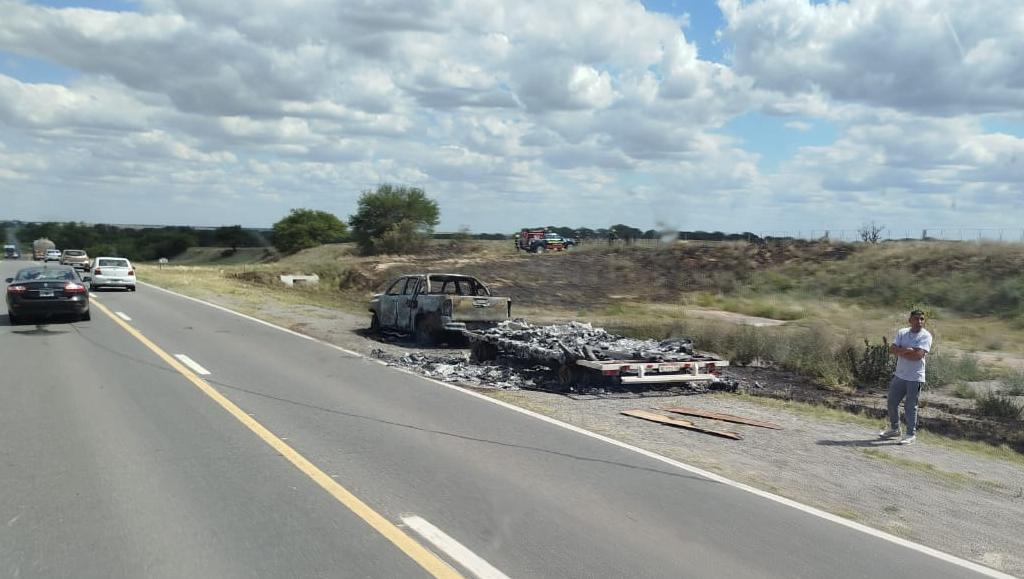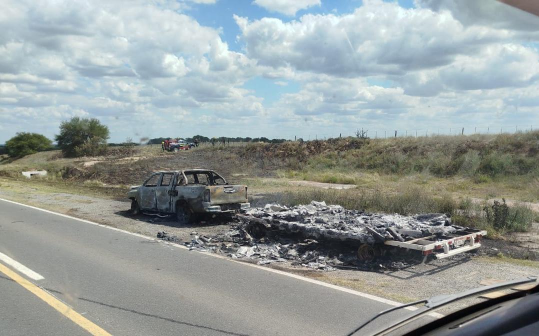 Un grave incidente vial se registró esta tarde en la Ruta Nacional 35, en el tramo comprendido entre Winifreda y Santa Rosa, donde un vehículo, su carro y la carga que transportaba quedaron reducidos a cenizas. El incendio, que se inició cerca de las 15:00 horas, provocó pérdidas materiales totales.
