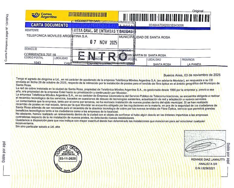 "Tengo el agrado de dirigirme a Ud., en mi carácter de apoderado de la empresa Telefónica Móviles Argentina S.A. (en adelante, Movistar), en respuesta a su CD enviada en fecha 28 de octubre de 2025, respecto de la intimación por la instalación de postes para el tendido de fibra óptica en el ámbito geográfico del Municipio de Santa Rosa. La red de cobre instalada en la ciudad de Santa Rosa, propiedad de Telefónica Móviles Argentina S.A., es gestionada desde 1990 por la empresa y, previo a ese año, era propiedad de la empresa Entel hasta su privatización y continuación por Movistar".