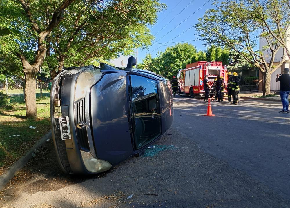 Una joven perdió el control de su automóvil Renault Symbol tras un aparente desperfecto mecánico, lo que provocó que el vehículo impactara contra una planta y terminara volcado sobre uno de sus laterales.