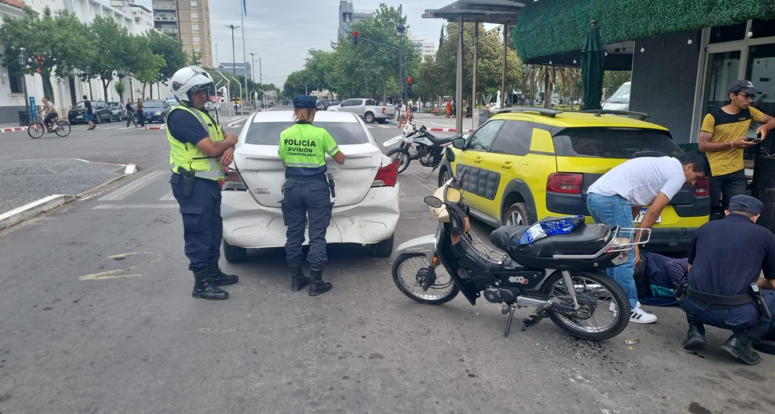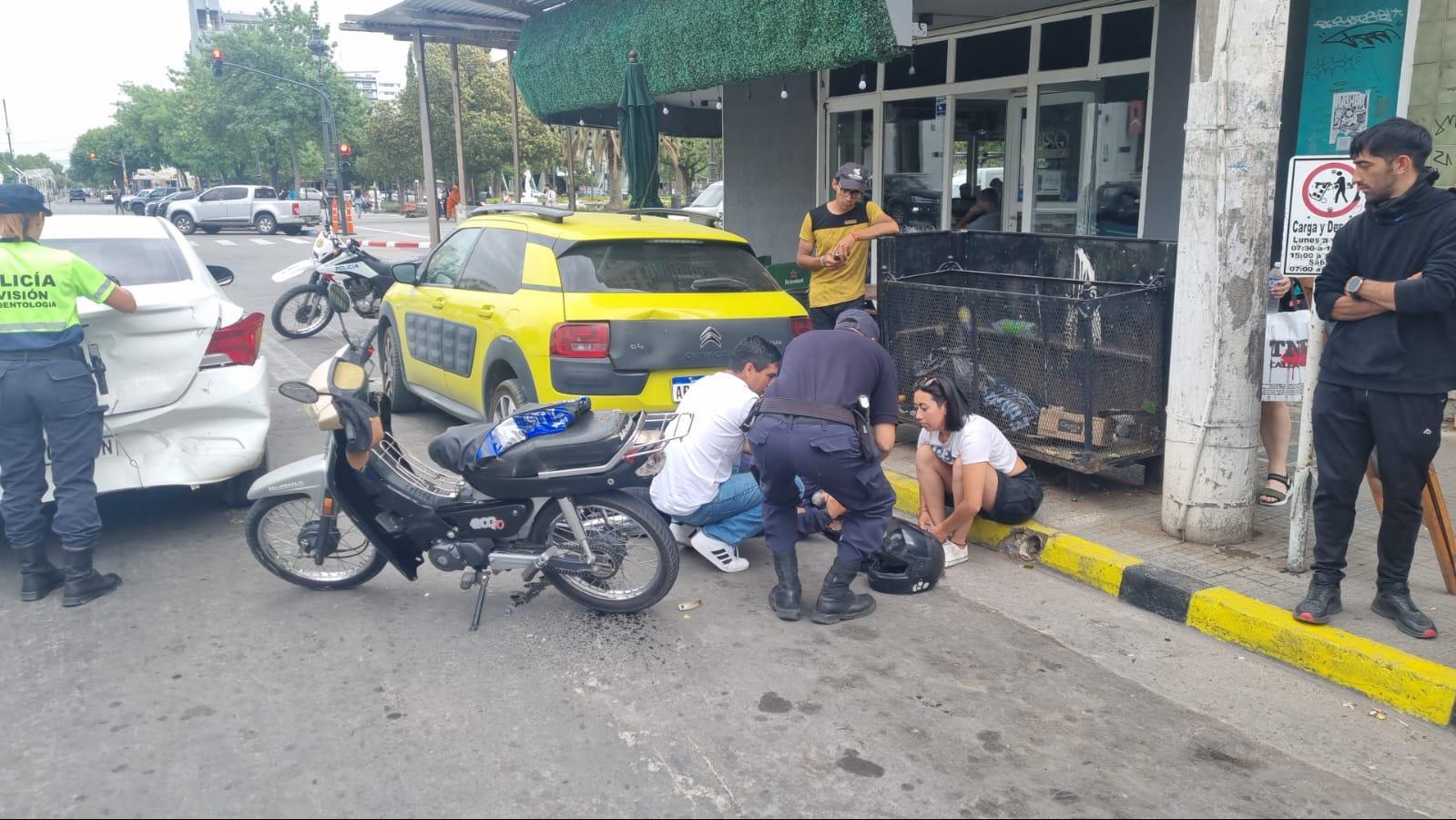 Como consecuencia del fuerte impacto, el motociclista quedó tendido en el piso y asistido por unos ocasionales transeúntes hasta que llegó una ambulancia. El auto sufrió un importante abollón a la altura del baúl.