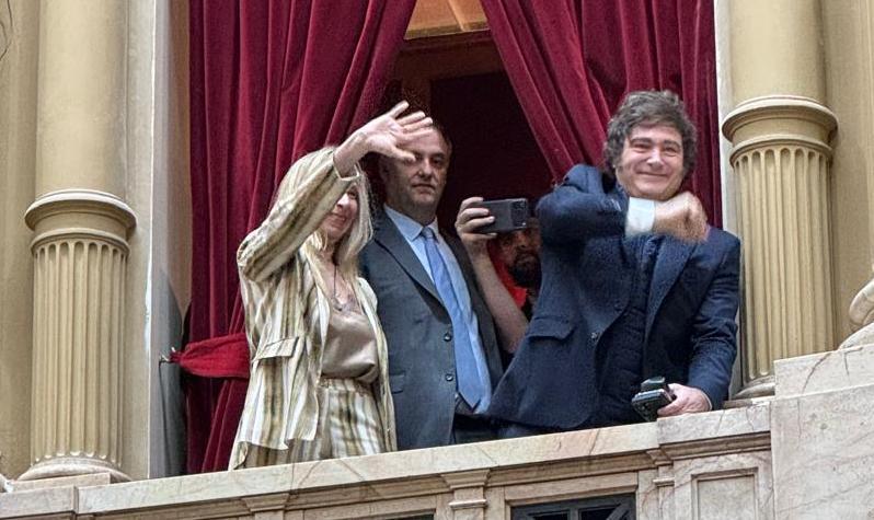 Milei le dedicó el clásico puño cerrado al corazón cuando la transmisión lo enfocó en el palco, mientras juraba el pampeano.