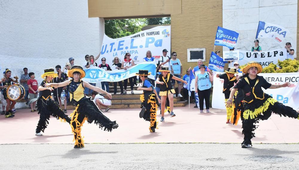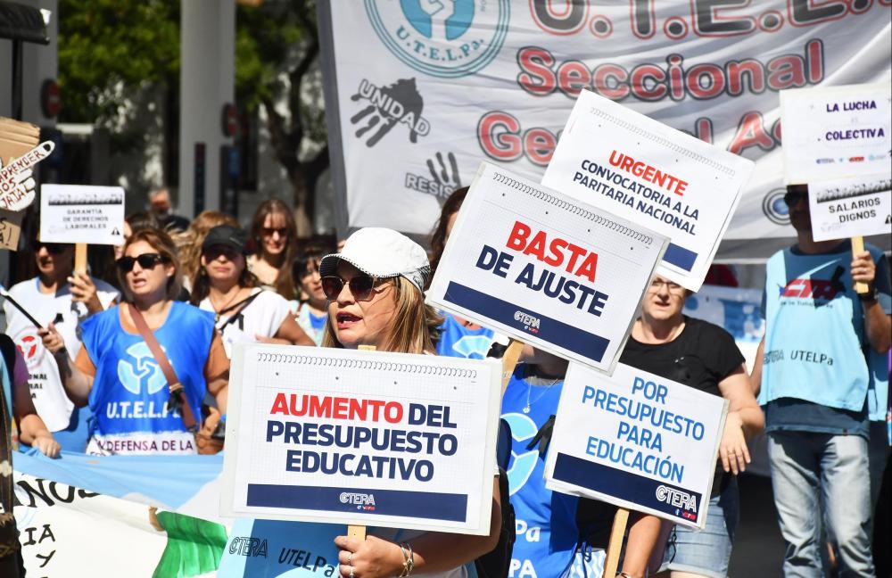 Una marcha de una cuadra de docentes, bajo un calor agobiante, avanzó este jueves por el centro de Santa Rosa en el marco del paro convocado por UTELPA ante el cierre de la paritaria sin oferta salarial del gobierno provincial. "No queremos más ajuste", cantaron las y los manifestantes. El gremio informó un acatamiento superior al 90%.