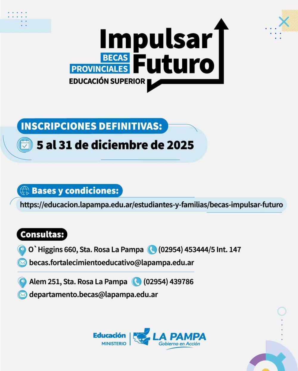 El Ministerio de Educación de La Pampa recordó que a partir de mañana, 5 de diciembre, y hasta el día 31 inclusive, se desarrollarán las inscripciones definitivas al programa de Becas "Impulsar Futuro".