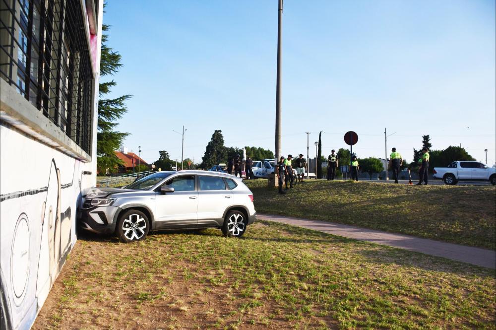 Uno de los accesos a la ciudad de Santa Rosa fue escenario este viernes de un siniestro vial: un vehículo que transitaba la rotonda, por motivos que se investigan, se desvió y salió de la cinta asfáltica en dirección del edificio del Colegio Belgrano.