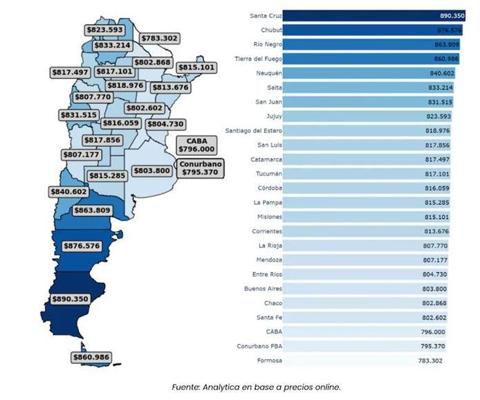 El sur se volvió la región más cara del país. Santa Cruz encabezó la lista con un costo total de $890.350, seguida por Chubut ($876.576), Río Negro ($863.809), Tierra del Fuego ($860.986) y Neuquén ($840.602). Esto se atribuyó al costo de vida, ya que la Patagonia ostenta los salarios más elevados. Los analistas explicaron que los mayores costos son en parte compensados por remuneraciones más altas, donde la ponderación promedio del costo de la canasta sobre dos salarios privados registrados es de 15,6%.