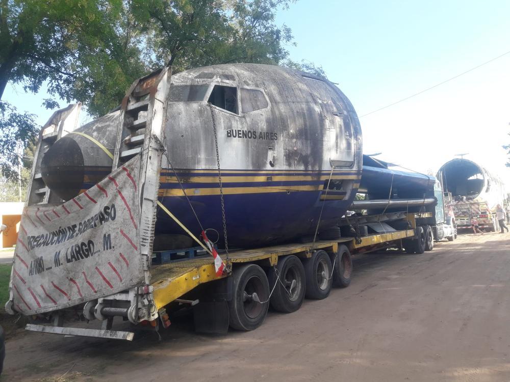 El excéntrico empresario movilizó en 2024 en dos camiones los restos de un enorme avión desguazado desde Toay hasta su base militar en el campo Don Manuel.