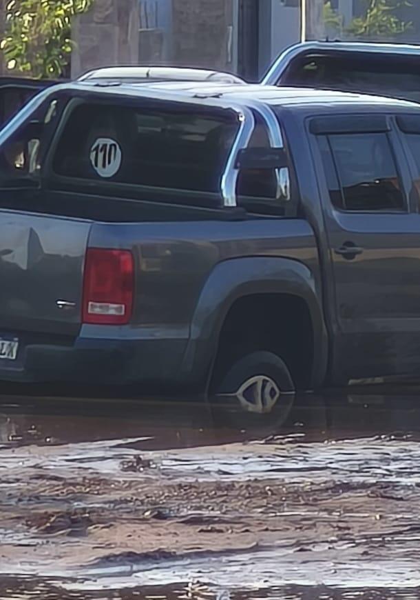 Uno de los puntos más afectados fue el barrio Nueva Vista, donde la acumulación de agua y barro volvió intransitable el cruce de las calles Eduardo Castex y Juan Bautista Alberdi. En ese lugar, una camioneta Volkswagen Amarok quedó encajada y no pudo continuar su marcha.
