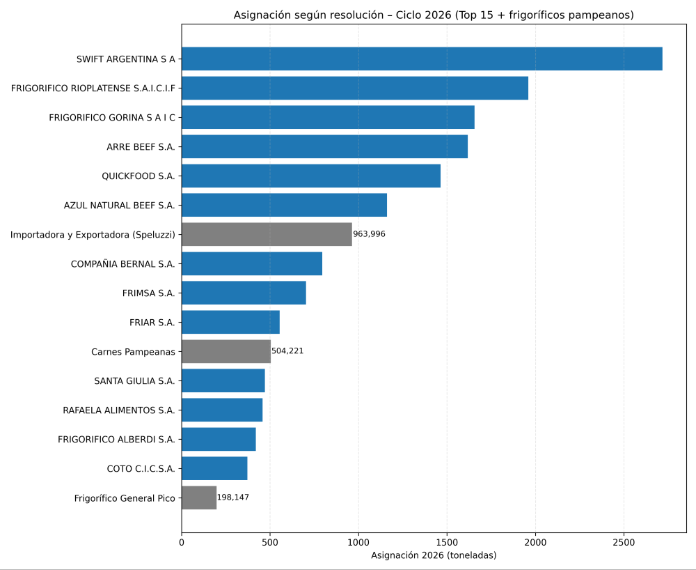 Del total asignado, 19.000 toneladas corresponden a la categoría Industria y 1.000 toneladas a Proyectos Conjuntos, manteniendo una alta concentración donde ocho grupos frigoríficos captan el 66% del cupo total,,.