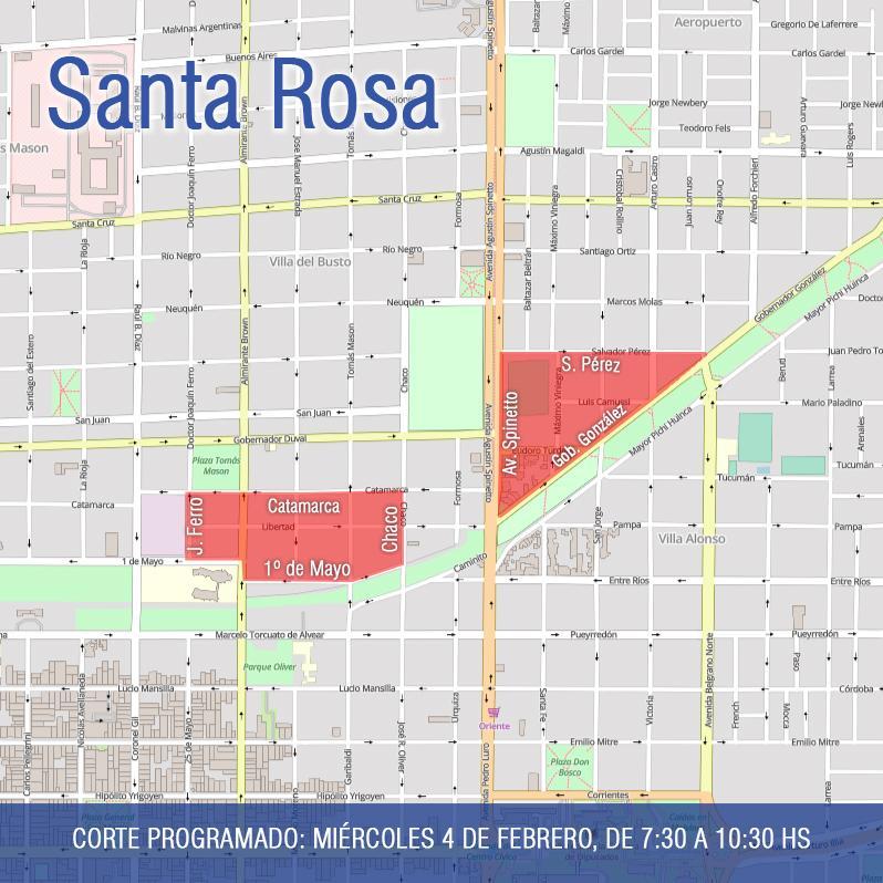 La CPE informó que este miércoles 4 de febrero, desde las 7:30 hasta las 10:30 horas, se interrumpirá el servicio eléctrico en la zona comprendida por las calles Catamarca, Chaco, 1° de Mayo y Joaquín Ferro de Villa del Busto, y la delimitada por la Avenida Spinetto y las calles Salvador Pérez y Gobernador González, de Villa Alonso Norte.
