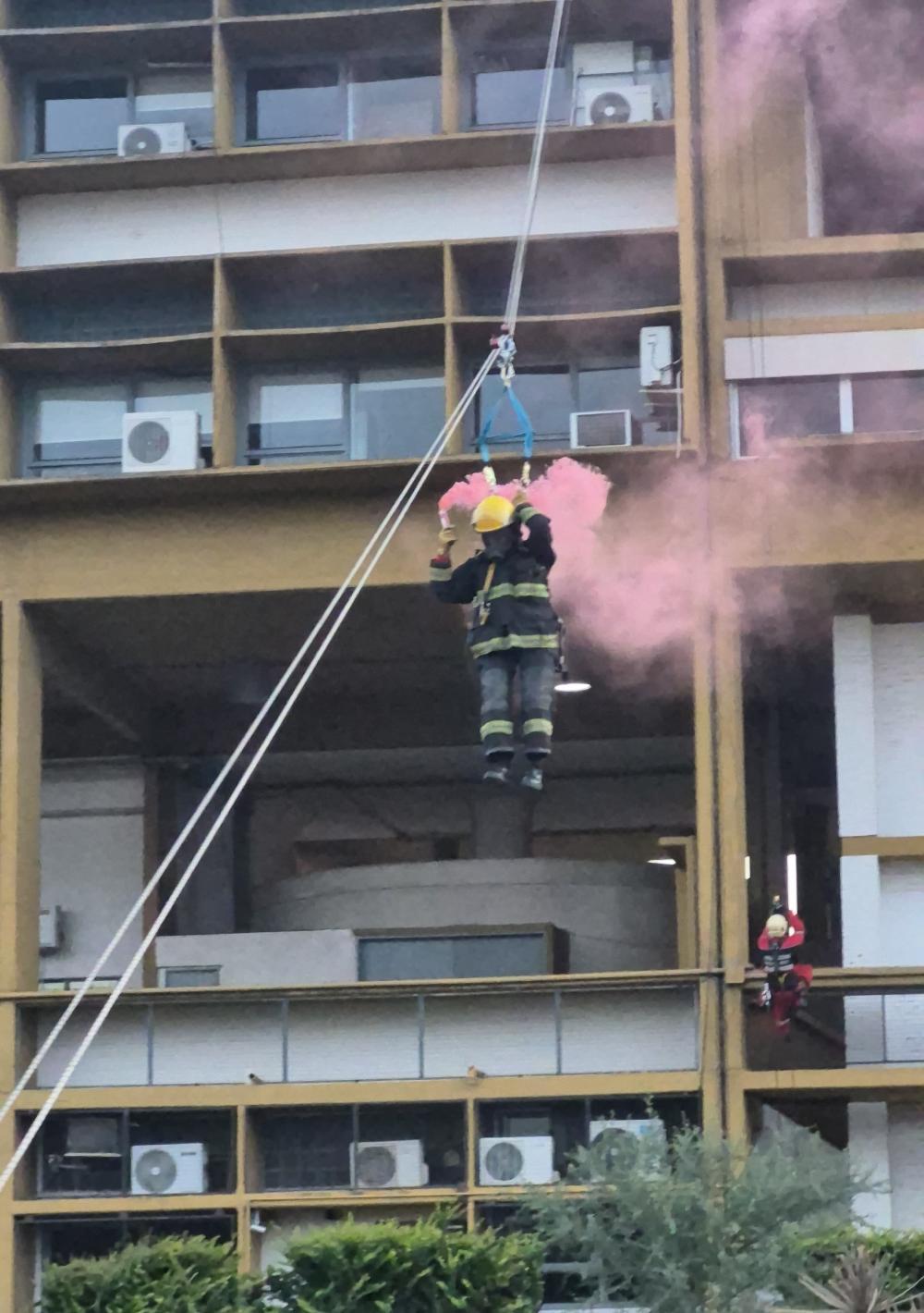 Durante la práctica se montó un sistema con dos cabeceras, superior e inferior, que permitió ejecutar distintas maniobras de rescate técnico. Entre ellas se desarrollaron descensos controlados a rápel, rescates por tirolina, ascensos por cuerdas paralelas, traslado de una víctima en camilla y ejercicios de estabilización en suspensión. Como cierre institucional, dos rescatistas realizaron un descenso simultáneo portando el Pabellón Nacional, marcando el final de la exhibición.