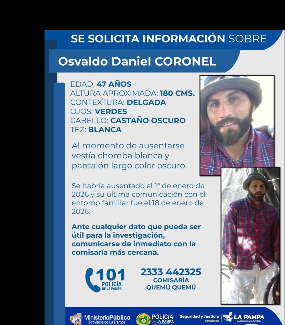 La justicia de la II Circunscripción del Ministerio Público Fiscal, con asiento en General Pico, inició formalmente una averiguación de paradero para localizar a Osvaldo Daniel Coronel, un hombre de 47 años oriundo de la localidad de Quemú Quemú. Según confirmaron las autoridades judiciales, el hombre se ausentó de su entorno habitual el 1 de enero de este año, pero la preocupación creció debido a que su última comunicación con la familia se registró el 18 de ese mismo mes.