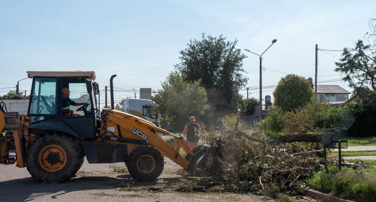 Los trabajos incluyen el uso de motosierras para reducir troncos y grandes gajos desprendidos, su posterior recolección y traslado. Se utilizan retropalas, camiones y volcadores para despejar las calles.