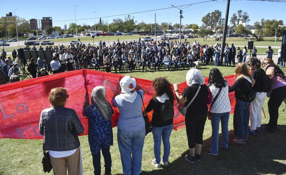El intendente Luciano di Nápoli y el gobernador Sergio Ziliotto encabezaron el acto oficial que comenzó a las 11:00 horas. La ceremonia contó con la participación de delegaciones escolares del Colegio Fernando Aráoz y el Domingo Savio, además de una nutrida presencia de funcionarios y referentes de distintos arcos políticos. La música también fue protagonista con la interpretación del Himno Nacional Argentino a cargo de Juan Cruz Santa Juliana y Victoria Mario.