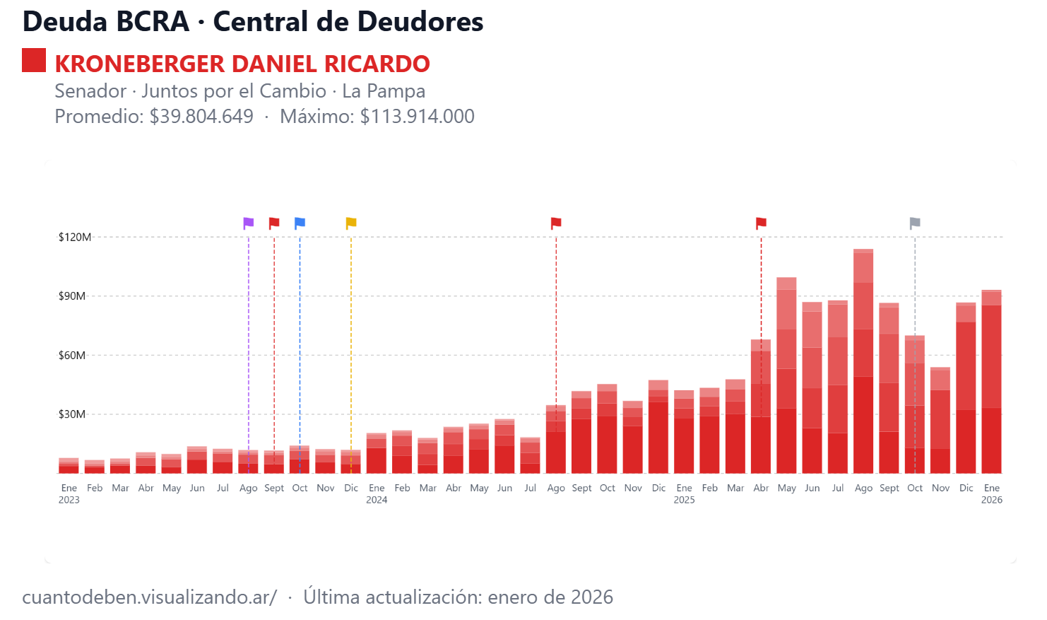 También aparece en el relevamiento de la plataforma "¿Cuánto deben?" -ideada por el visualizador de datos Andrés Snitcofsky?- el senador radical Daniel Kroneberger, que mantiene compromisos con varias entidades: 52.323.000 pesos con el Banco de La Pampa, 968.000 pesos con el Banco Santander, 6.667.000 pesos correspondientes a una financiación de Volkswagen y 33.173.000 pesos con el Banco Nación.