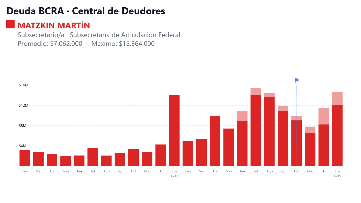 El listado también incluye al funcionario nacional Martín Matzkin, quien registra 2.533.000 pesos con el Banco Nación y 12.092.000 pesos con el Banco de La Pampa. Matzkin es subsecretario de Programación Federal y Articulación Legislativa en el Ministerio de Seguridad de la Nación