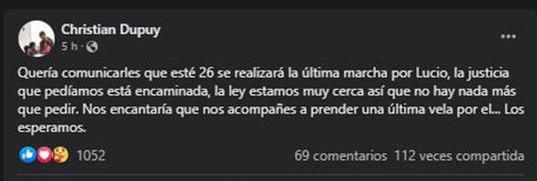 Este lunes 26 de diciembre, 13 meses después del crimen del pequeño Lucio Dupuy, se realizará la última marcha en reclamo de justicia por el hecho. "La justicia que pedíamos está encaminada", sostuvo Christian Dupuy, papá del niño de 5 años.
