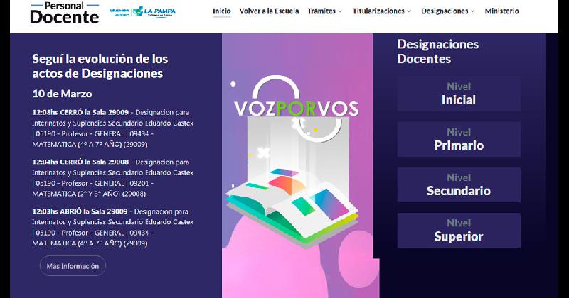 A partir del 22 de febrero, se efectuaron 1720 designaciones referidas a Interinatos y Suplencias a través del sistema informático “Voz por Vos” en todos los niveles y modalidades, en las localidades de Santa Rosa y General Pico - en el Centro de Designaciones de Primaria y Secundaria - y en General Acha, 25 de Mayo, Intendente Alvear y Eduardo Castex - en el Centro de Designaciones de Secundaria. En el resto de las localidades de la Provincia, se desarrollaron 984 designaciones en forma digital mediante correo electrónico.