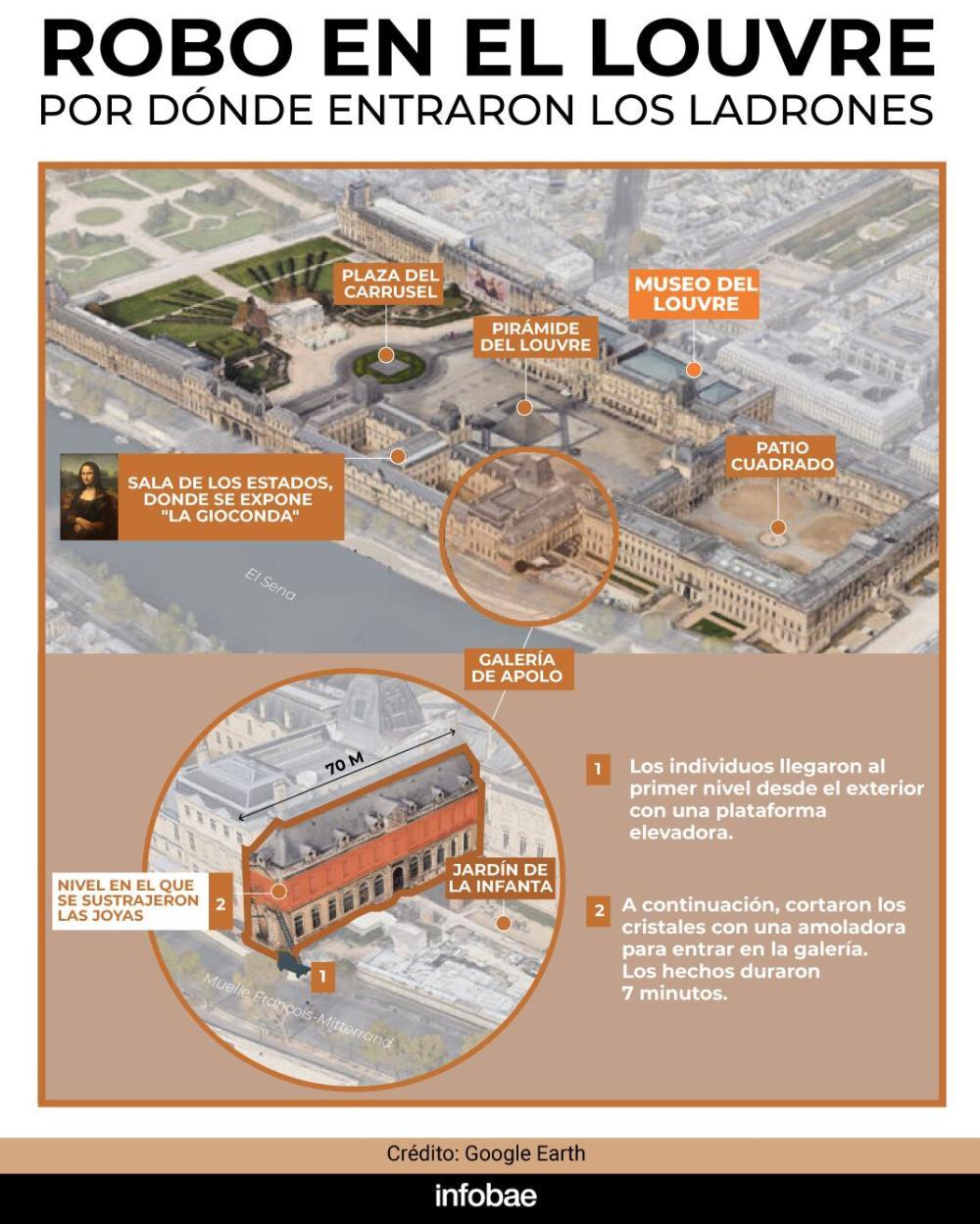 El periódico Le Parisien informó que los asaltantes irrumpieron en el antiguo palacio y museo más visitado del mundo por la fachada que da al río Sena, donde actualmente se realizan obras de construcción. Según el diario, los responsables utilizaron un montacargas de obra para llegar directamente a la Galerie d'Apollon, espacio donde se exhiben una selección de las Joyas de la Corona francesa.