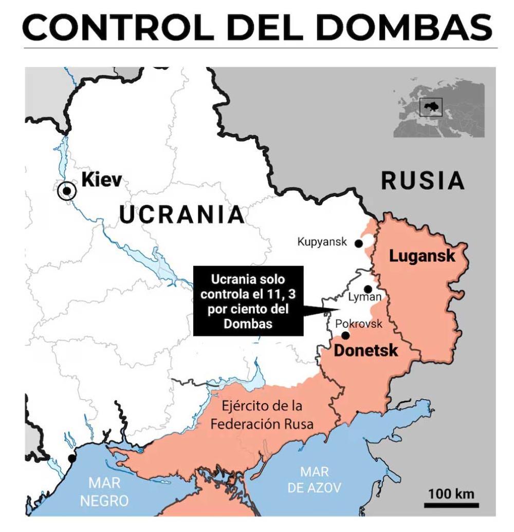 Cesión territorial: Crimea, Lugansk y Donetsk serán reconocidas de facto como rusas. Las regiones de Kherson y Zaporiyia quedarán congeladas a lo largo de la línea de contacto. Rusia renunciaría a otros territorios controlados fuera de estas cinco regiones.