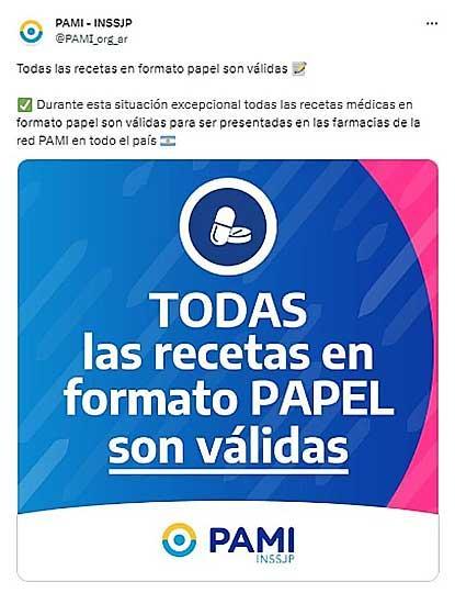 Desde el organismo -la mayor obra social del país, con cinco millones de afiliados- intentan transmitir tranquilidad y han adaptado los trámites para poder mantener la prescripcion de recetas y la despensa de medicamentos en farmacias como la renovación de los tratamientos en curso, "todas las recetas y órdenes médicas se realizarán en receta papel emitidas por los médicos de cabecera y profesionales de la salud".