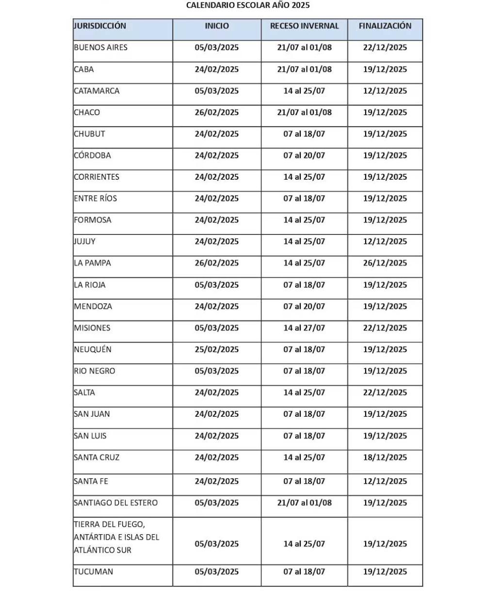 En cambio, el receso invernal será del 7 al 18 de julio en Chubut, Córdoba, Entre Ríos, La Rioja, Mendoza, Neuquén, Río Negro, San Juan, San Luis, Santa Fe y Tucumán.