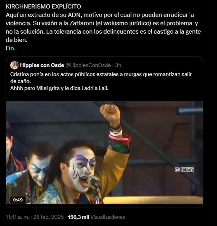 "KIRCHNERISMO EXPLÍCITO. Aquí un extracto de su ADN, motivo por el cual no pueden erradicar la violencia", criticó el mandatario a través de su cuenta de X.