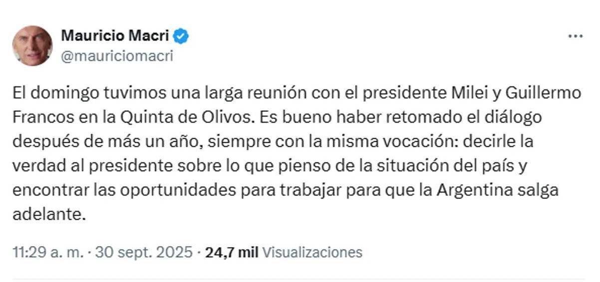 "El domingo tuvimos una larga reunión con el presidente Milei y Guillermo Francos en la Quinta de Olivos. Es bueno haber retomado el diálogo después de más un año", escribió el exmandatario.