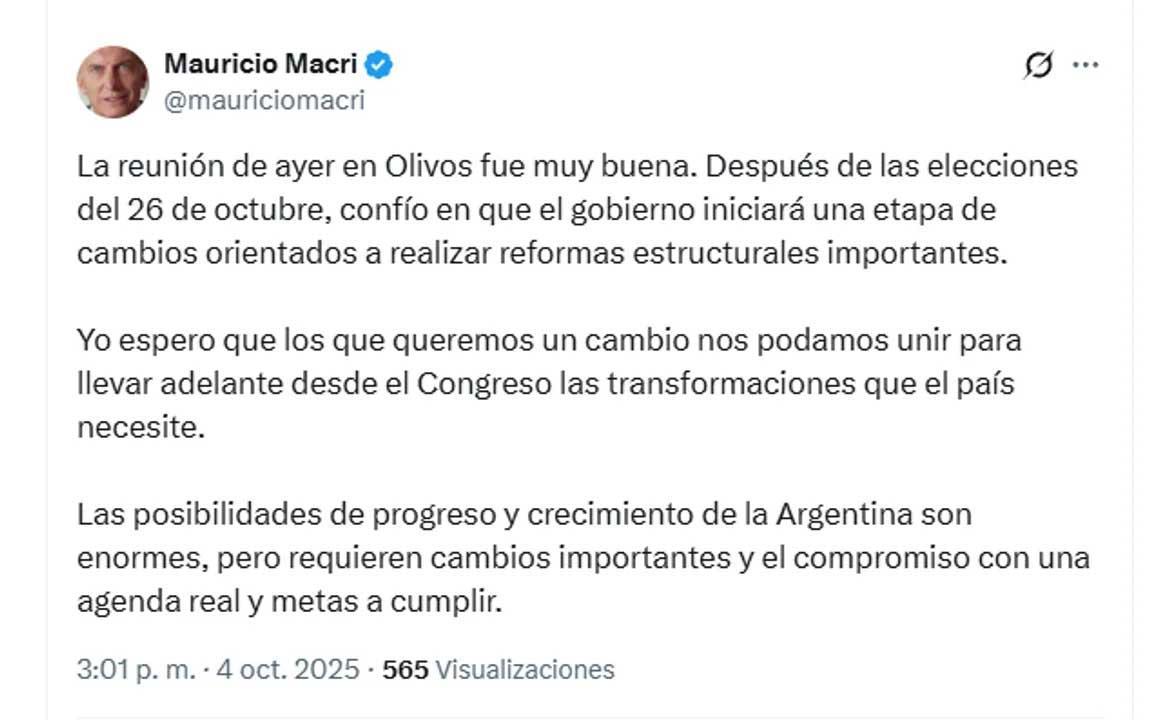 En su publicación, Macri agregó: "Yo espero que los que queremos un cambio nos podamos unir para llevar adelante desde el Congreso las transformaciones que el país necesite". Este llamado a la unidad post-electoral es la confirmación del pacto que ambos líderes sellaron en la reunión, de la que también participaron el jefe de Gabinete, Guillermo Francos, y la secretaria General de la Presidencia, Karina Milei.