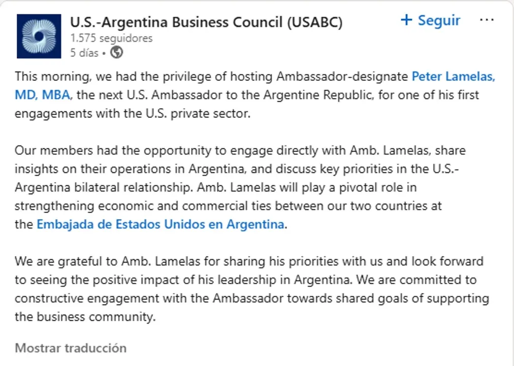 La declaración de Lamelas se produjo luego de uno de sus primeros encuentros formales con el sector privado, organizado por el U.S.-Argentina Business Council (USABC), la cámara que agrupa a las mayores empresas estadounidenses con intereses en el país.