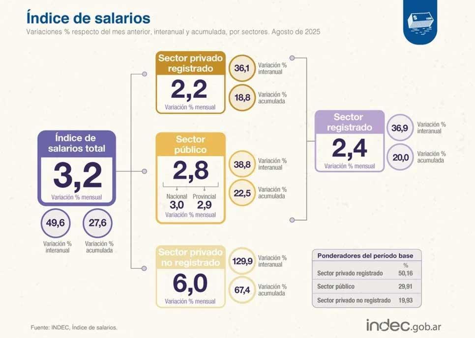 Los salarios registraron una suba del 3,2% en agosto y se ubicaron por encima de la inflación de ese mes, la cual fue del 1,9%, según informó el Instituto Nacional de Estadísticas y Censos (INDEC).