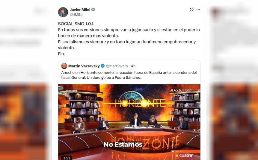 El presidente Javier Milei esta mañana reiteró sus críticas al socialismo y compartió un posteo contra el gobierno de España que encabeza Pedro Sánchez, con quien tuvo un altercado a principios de su mandato.